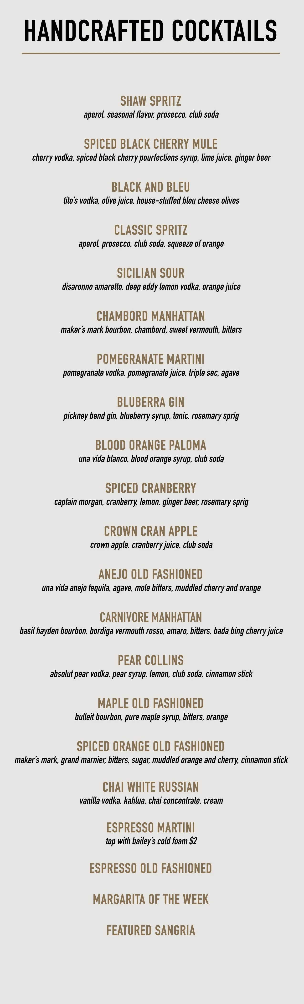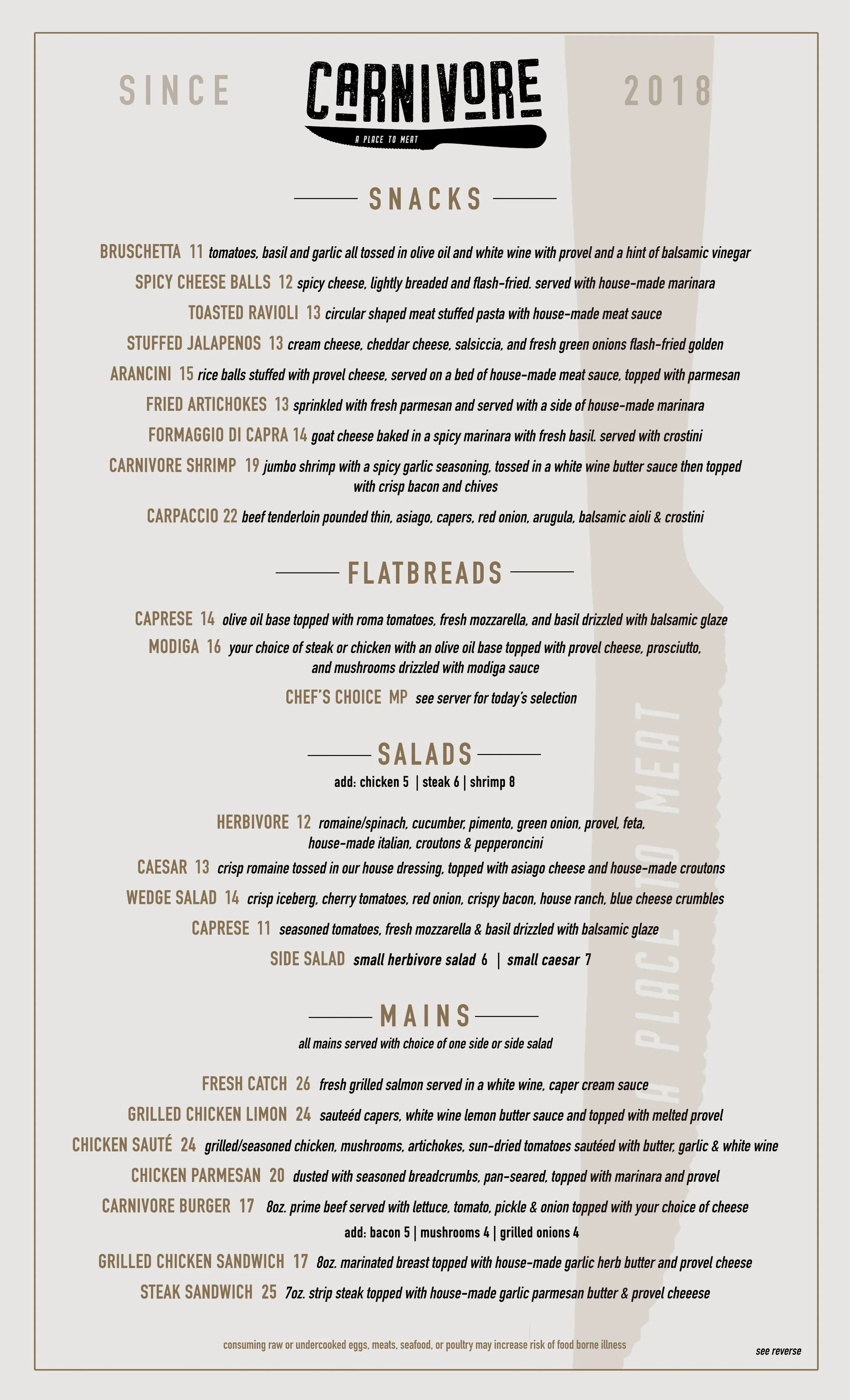 Ranked as the best New Spot to Try in St. Louis: July 2018 (FEAST Magazine), Carnivore STL fills the nearly 4,000-square-foot space on The Hill with a dining area, bar lounge, and outdoor patio gracefully guarded by a bronze steer at the main entrance. The interior highlights an warm, contemporary feel, comfortable for everything from the serious business meeting to grandma's birthday alike. As you enter the dining room, a hand-painted mural of the Hill’s culinary highlights, by artist Wendy Weller, colorfully connects diners to the new addition to the neighborhood.